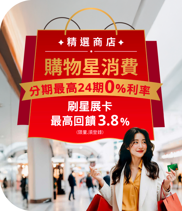 - 請注意特約商店有權決定適用本活動之商品及其得分期之期數與門檻,持卡人登錄或購物前請先確認該商品是否適用本活動。
