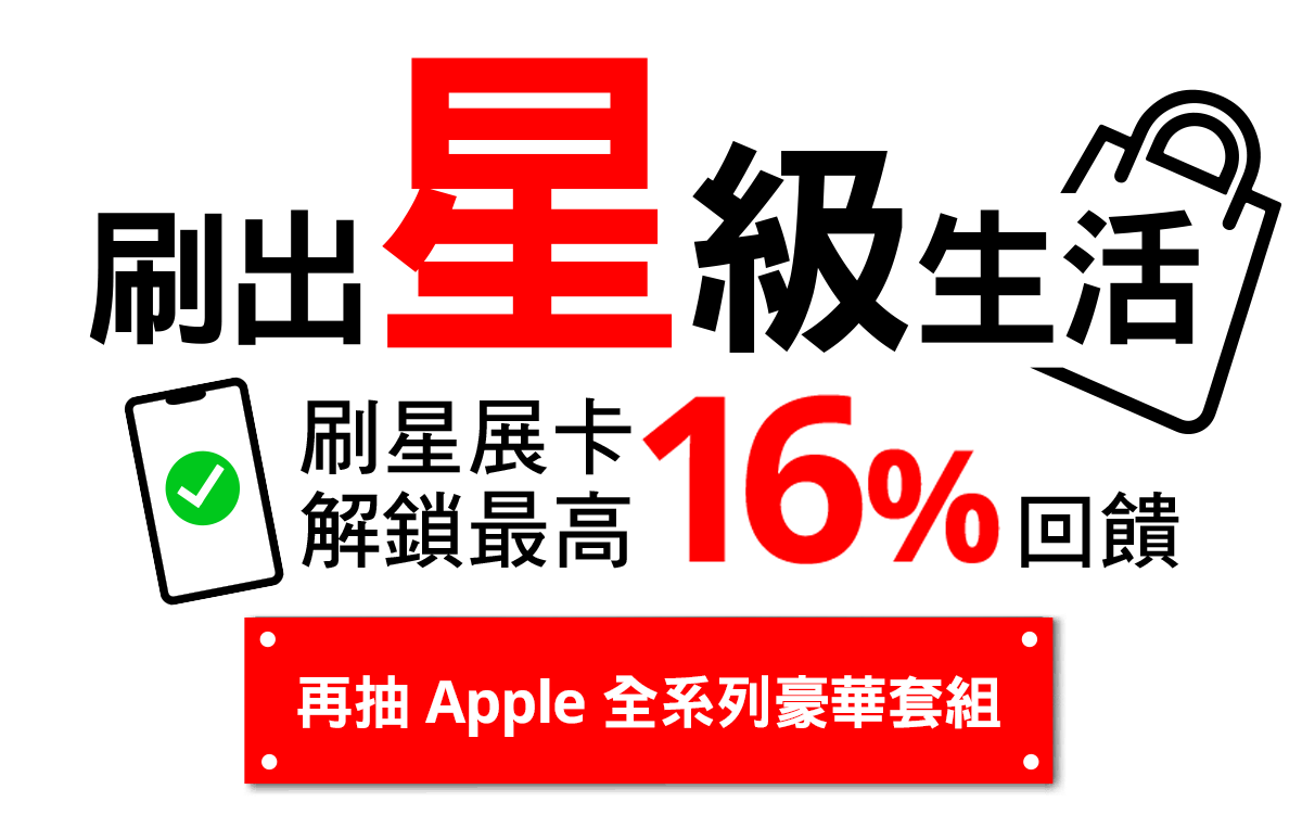 - 【刷星展卡解鎖最高16%回饋-加碼15%回饋】每月一般消費計算係指:2026/5/1-5/31的一般消費需於6/10前入帳;2026/6/1-6/30前的一般消費需於7/10前入帳;2026/7/1-7/31前的一般消費需於8/10前入帳;2026/8/1-8/31前的一般消費需於2026/9/10前入帳。【再抽Apple全系列豪華套組】每月抽獎計算係指:2026/5/1-8/31的一般消費需於9/10前入帳才會計入抽獎次數。若因廠商遲延請款或其他因電腦、網路、電話、技術或不可歸責於本行與特約商店之事由,致使該交易金額不納入計算,恕不得要求回饋。