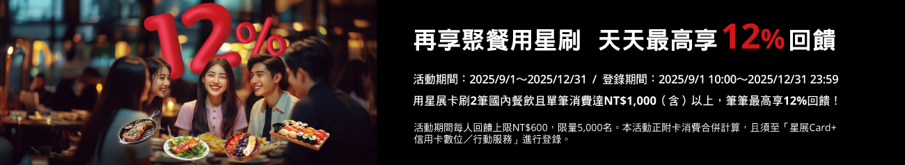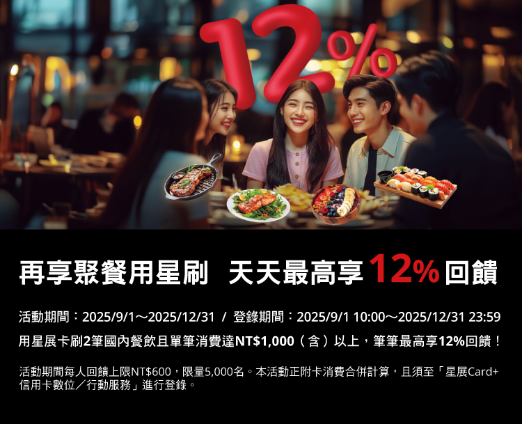 - 本優惠專案須於活動期間2025/10/15~2025/12/31於指定餐廳點餐前主動告知為星展信用卡卡友並以星展實體信用卡支付當次消費全額款項使用,本專案所贈送之餐點不得要求折抵現金。若未提前告知或離櫃後,恕無法享有優惠。