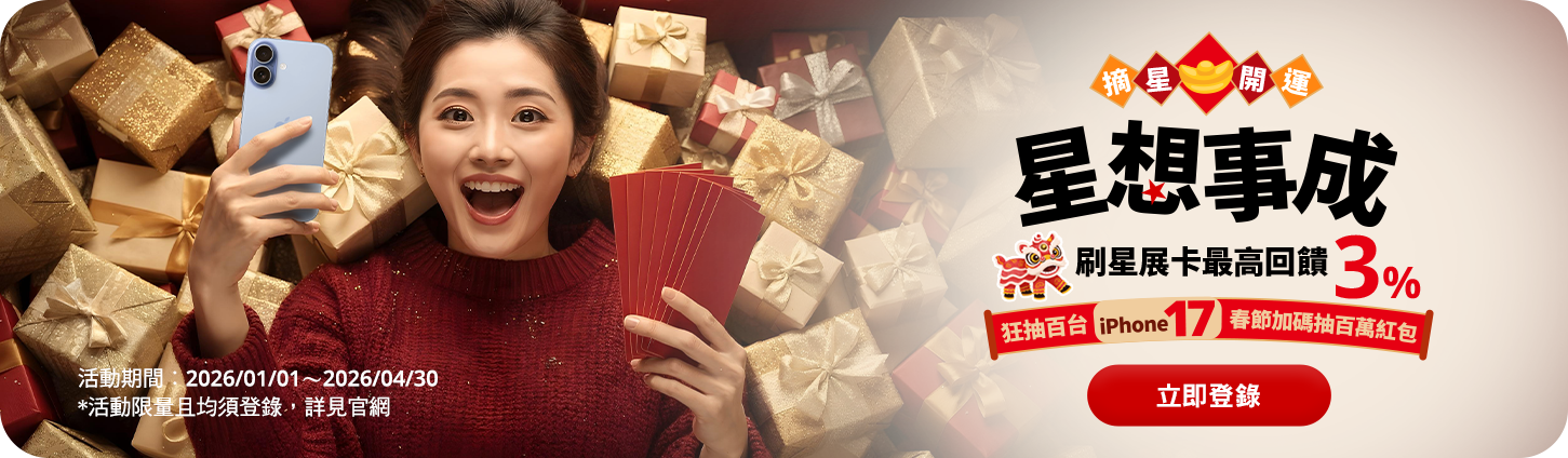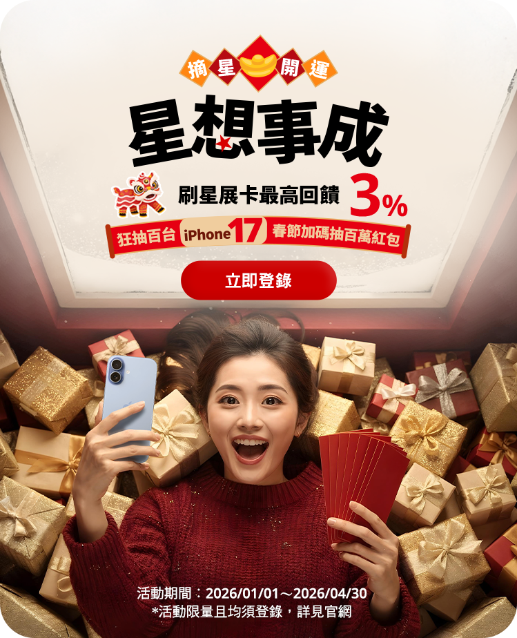 - 本活動限以星展信用卡於2026/1/1~2026/4/30內完成保險費繳費交易,且請款入帳日於2026/1/1~2026/5/10內始得計算滿額,並需完成登錄始符合回饋資格。