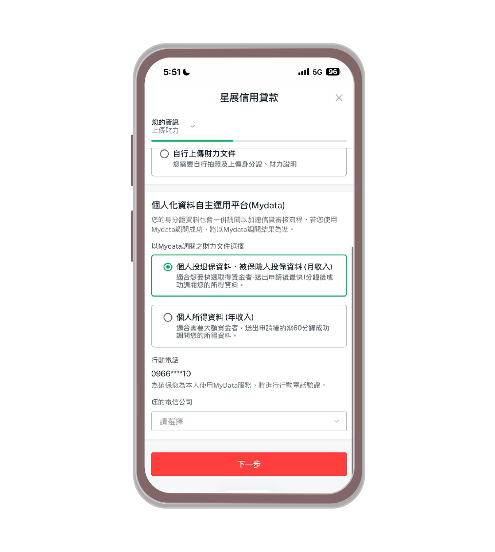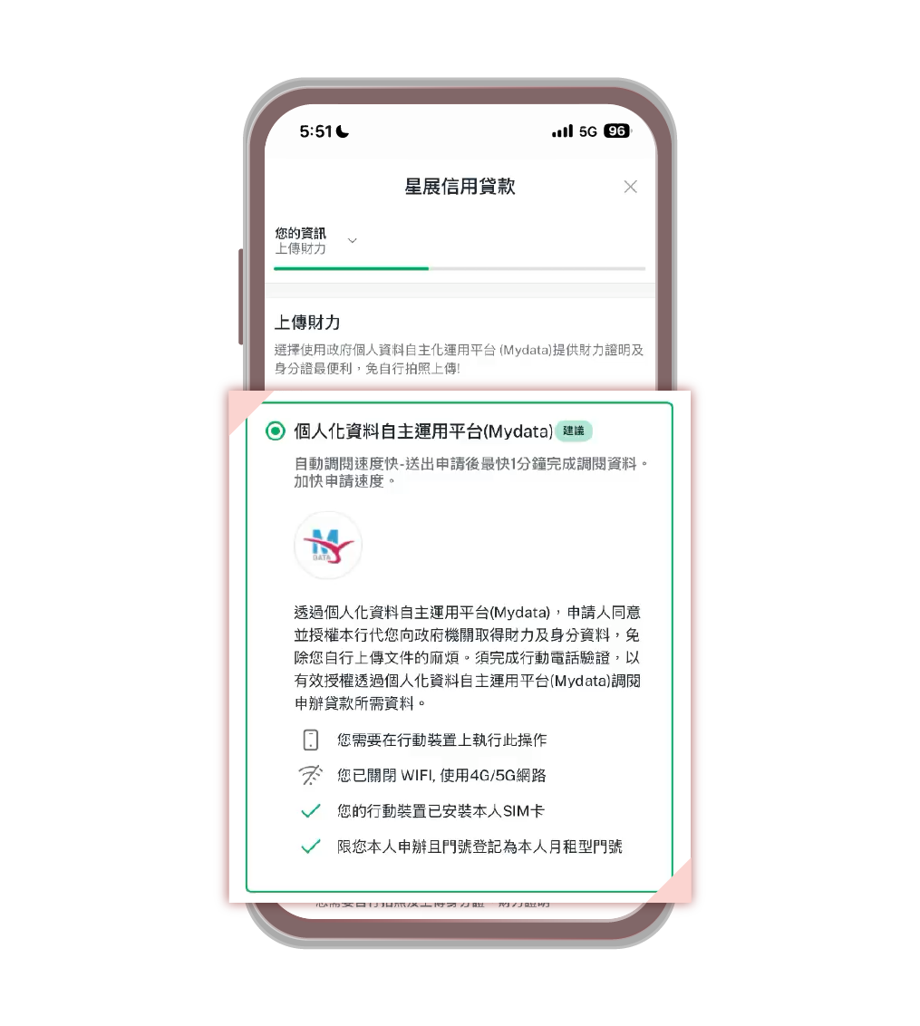 建議您優先選擇手機門號驗證方式,無需額外準備其他資料,一機在手即可輕鬆完成MyData驗證與授權!