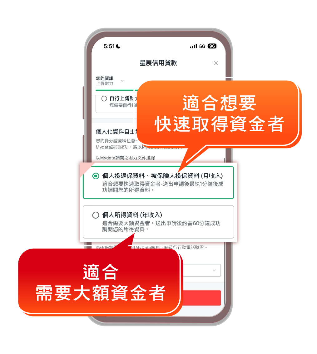 目前在申請星展信貸時,您可以透過MyData選擇提供以下兩種主要財力證明類型,作為信貸審核使用: