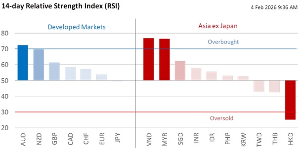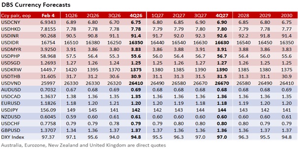 AUD is this year’s top-performing currency, appreciating 5.2% YTD against the USD as of February 3. AUD/USD has traded in a 0.69-0.71 range since January 26, following a rally from 0.67 amid USD-debasement concerns. The Reserve Bank of Australia’s 25-bps hike to 3.85% yesterday may open the door for AUD/USD to trade into a higher 0.70-0.75 range after three years of trading in sub-0.70 levels. The futures market is not ruling out another hike at the May 5 meeting after RBA Governor Michele Bullock framed the move as an insurance hike to prevent inflation from running away as it did after the Covid-19 pandemic.