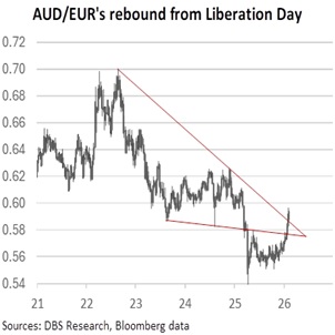 Against this background, the AUD/EUR cross rate may be building upside momentum to test the 0.60 resistance. The currency pair stabilized around 0.55 after Liberation Day, ending its three-year decline from 0.70.