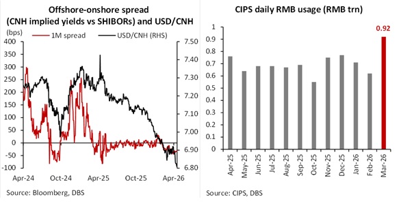 By contrast, offshore CNH rates are likely to remain anchored and stay below the onshore rates. The strengthening CNH exchange rate allows the PBoC to pause bill issuance. The authority is also maintaining ample offshore CNH liquidity to support RMB internationalisation. This is particularly evident as CIPS (Cross-Border Interbank Payment System) daily RMB settlement reached RMB0.92tn in March, with single-day usage exceeding RMB1tn following the US–Iran conflict. On the policy front, authorities have recently introduced measures to encourage offshore lending and keep up with the liquidity. The overseas loan leverage ratio for locally incorporated wholly foreign-funded banks and domestic branches of foreign banks has been raised from 0.5x to 1.5x, effective this Wednesday. The ratio for the Export-Import Bank of China has also been increased from 3.0x to 3.5x.