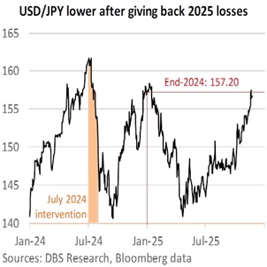 Markets are on high alert for intervention to arrest the JPY’s weakness. USD/JPY retreated to 156.40 last week after rising to 157.90 last Thursday, above its end-2024 level of 157.20. Finance Minister Satsuki Katayama warned that interventions would be a possible response to the JPY’s rapid one-sided depreciation. Government panel member Takuji Aida said interventions may come before USD/JPY rose to 160. Japan intervened in the currency market in July 2024 when USD/USD hit a 38-year high of around 161.96.