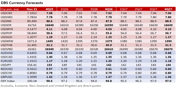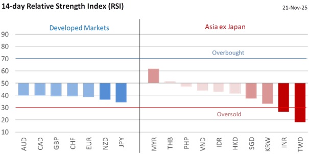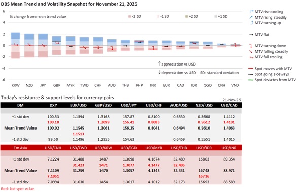 Heading into the US Thanksgiving holiday-shortened trading week, the USD faces profit-taking risks. The DXY Index’s rise stalled in a 100-100.4 range despite a better-than-expected reading of 119k for US nonfarm payrolls (NFP) in September. US Labor Secretary Lori Chavez-DeRemer looked past the NFP and urged the Fed to cut rates again. NFP is likely to be weaker again in October due to the government shutdown. More importantly, the unemployment rate increased to a four-year high of 4.4%. The Fed remains divided over a December rate cut, but the debate is no longer as one-sided as it was after Fed Chair Jerome Powell’s late October remark that a December cut was not a forgone conclusion. New York Fed President John Williams, also a permanent voter and vice chair of the rate-setting FOMC, viewed monetary policy as modestly restrictive, with room for a near-term rate cut to bring the policy stance closer to neutral.